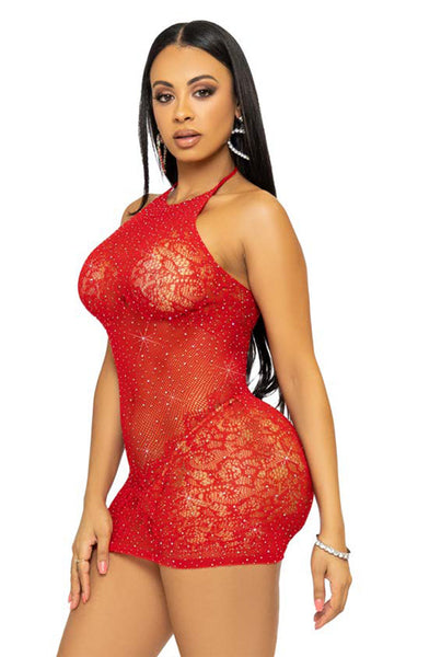 This stunning mini dress features gleaming rhinestone lace and halter neck style, for a look reminiscent of stars in the night sky. Paired with a flirty g-string, this sexy lingerie dress is sure to be a bedroom favorite.