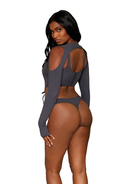 Rib knit sleepwear bustier, thong and shrug set features fully-boned bodice with lace-up grommet detail and adjustable hook & eye back closure. Separate shrug has open, cold-shoulder detail. Perfect for wedding night, honeymoon, Valentine's Day Gift for her, anniversary, lounge wear, sexy gift, bridal party, roleplay, cosplay, lingerie party, bedroom gift, romance fantasy.
