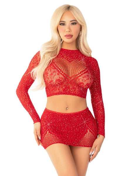 Unleash your inner goddess with this sultry 2-piece rhinestone lingerie set. Designed to dazzle, this set features a lace and net crop top with a captivating heart keyhole accent, paired with a matching mini skirt that hugs your curves in all the right places. Whether you're turning up the heat in the bedroom or stepping out in daring style, this lingerie set ensures you'll be unforgettable.