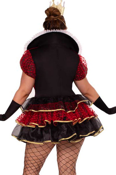 Rule the costume kingdom in style with this 2 PC Queen of Hearts Costume for Women. This iconic ensemble features a dramatic tiered dress with a stay-up collar that frames your royal entrance. A built-in petticoat gives the skirt extra volume for a grand, fairytale-inspired silhouette. The costume is completed with a regal crown to let everyone know who's in charge.