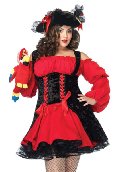 The velvet corset front cinches your waist to enhance curves and create a dramatic, hourglass silhouette. Pair it with a petticoat (sold separately) and a pirate hat to complete your high seas ensemble. Whether you’re commanding a crew or dancing the night away, this costume is your go-to for fearless, feminine flair.