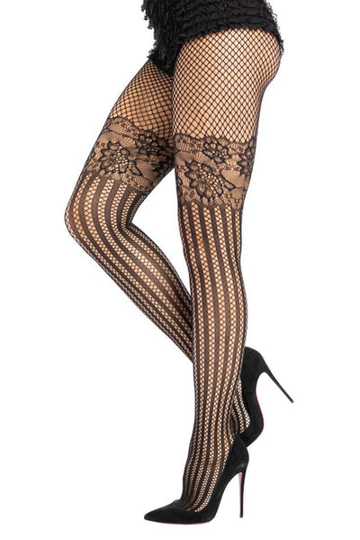 Create a striking impression with the Illusion Lace Top Net Striped Tights. Featuring a bold striped net design and an elegant lace waistband that gives a layered illusion effect, these tights blend edgy style with feminine charm. Soft, stretchy, and flattering, they’re the perfect finishing touch to elevate lingerie looks or add a daring twist to your favorite outfit.