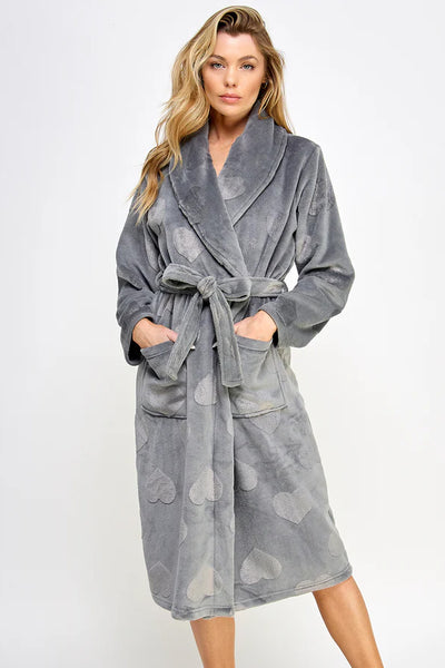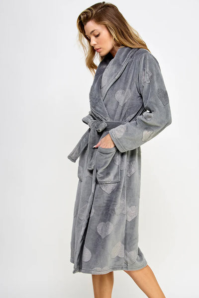 Wrap yourself in cozy elegance with the Beverly Robe, designed to deliver both warmth and style. Crafted from ultra-soft plush fabric with a subtle heart pattern, this robe brings a touch of sweetness to your everyday lounging routine. Featuring a classic collar, long sleeves, convenient front pockets, and a matching tie belt for a customizable fit, it falls below the knee for comfortable coverage. Perfect for slow mornings, relaxed evenings, or anytime you want to feel snug and effortlessly chic.