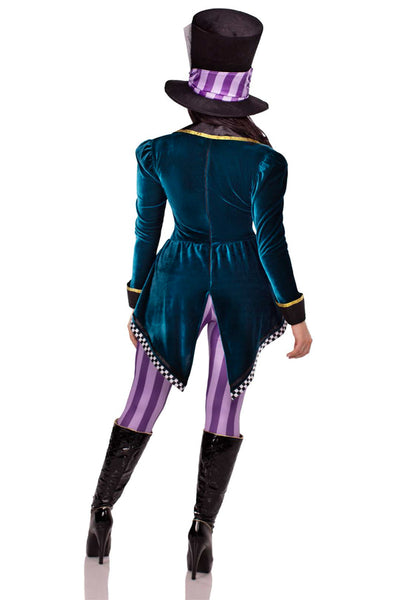 3-Piece Costume Set: Includes a statement jumpsuit with velvet tailcoat, a bow tie, and a classic Mad Hatter top hat